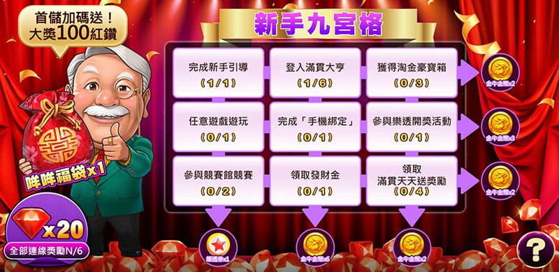 - 活動期間內,符合活動對象資格的玩家,可於大廳下方『更多好康>新手任務』中進入查看任務。
