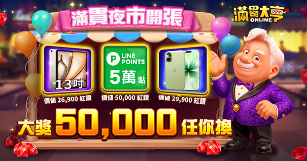 - 活動期間內於大廳上方「儲值-紅鑽」頁籤、「官網儲值-點數儲值」,累積儲值達100元,即可至公告任務領取「爺爺彩票包」,開啟可隨機獲得爺爺彩票。蒐集指定數量即可至「大廳下方→夜市兌換」換獎勵!