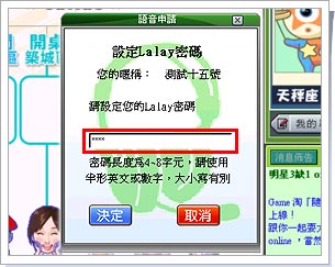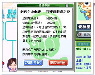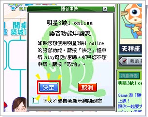 語音功能開放後,玩家進入遊戲會看到自動跳出一個『語音功能申請』的視窗。如果您想使用 3 缺 1 與啦咧的語音功能,請按確定鈕申請密碼。 |