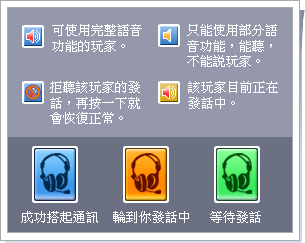 沒有人在發話時,由先按發話按鈕 ( 即耳機麥克風造型的按鈕 ) 的人取得發話權。取得發話權的玩家該按鈕會由藍色變成橘色。而他在右側的喇叭按鈕也會變成亮黃色,顯示此人正在通話。 |