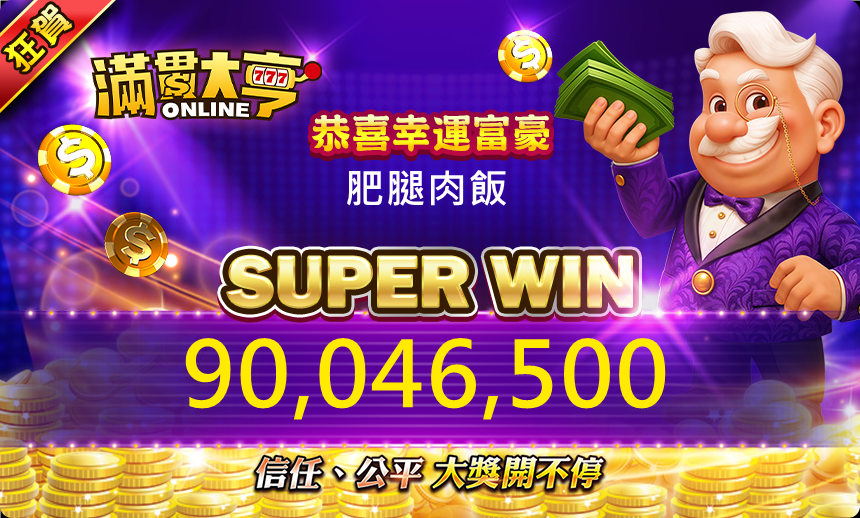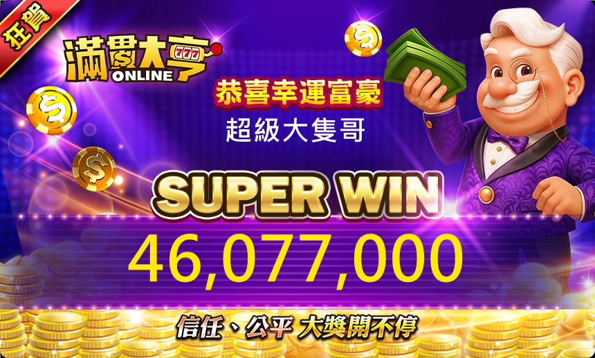 恭喜玩家超級大隻哥奪得大獎72,000,000機台編號58得獎時間 2026/02/11 -