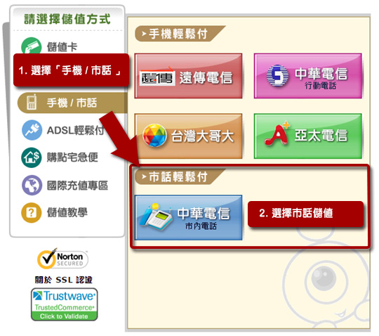 Step 1 在「儲值淘點」的頁面,選擇「手機 / 市話」→「中華電信(市內電話)」。