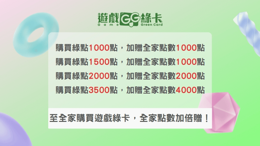 ► 活動詳情: 凡購買遊戲綠卡面額1000元以上,即加贈 全家點數,最高回饋14% 。