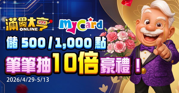 - 活動期間內,於指定超商通路儲值MyCard活動點卡品項,馬上送超值禮包!